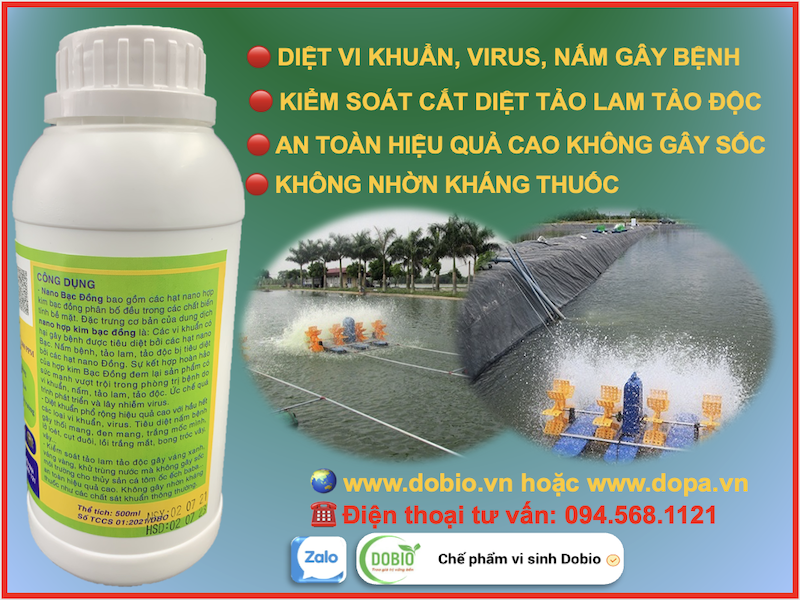 Thuốc DOBIO nano bạc đồng chính là giải pháp chấm dứt hết mọi điều lo lắng của bà con. DOBIO 2000 được biết đến là một loại thuốc sát khuẩn, diệt tảo lam, an toàn trong sử dụng, lựa chọn số 1 cho những người chăn nuôi thủy hải sản đặc biệt tốt cho các loại tôm, cá, ếch, ốc hương… DOBIO VIỆT NAM là nhà sản xuất và phân phối vi sinh xử lý đáy ao nano bạc đồng, dung dịch được đóng gói trong lọ thể tích 500ml.